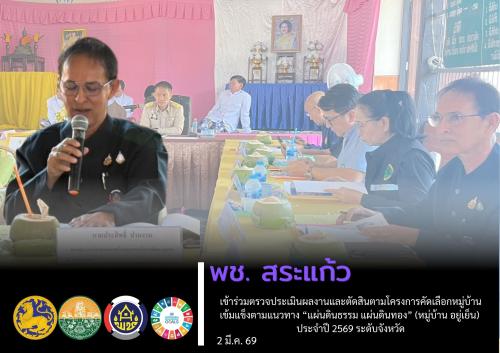 นายชัยณรงค์ รักษารัตน์ พัฒนาการจังหวัดสระแก้ว มอบหมายให้ นายประสิทธิ์ ปานงาม ผู้อำนวยการกลุ่มงานประสานและสนับสนุนการบริหารงานพัฒนาชุมชน เข้าร่วมตรวจประเมินผลงานและตัดสินตามโครงการคัดเลือกหมู่บ้านเข้มแข็งตามแนวทาง “แผ่นดินธรรม แผ่นดินทอง” (หมู่บ้าน อยู่เย็น) ประจำปี 2569 ระดับจังหวัด ซึ่งโครงการนี้มีวัตถุประสงค์เพื่อส่งเสริมให้หมู่บ้านมีการสร้างความเข้มแข็งจากฐานราก โดยนำหลักธรรมทางศาสนามาเป็นแนวทางในการดำเนินชีวิต ควบคู่ไปกับการสร้างความรักความสามัคคี และการมีส่วนร่วมของคนในชุมชน เพื่อให้เกิดการพัฒนาที่ยั่งยืนและประชาชนมีความเป็นอยู่ที่ดีขึ้น