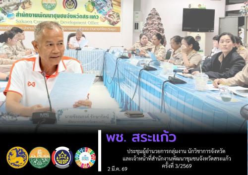 วันจันทร์ที่ 2 มีนาคม 2569 เวลา 14.30 น. ณ ห้องประชุมสำนักงานพัฒนาชุมชนจังหวัด ชั้น 4 ศาลากลางจังหวัดสระแก้ว