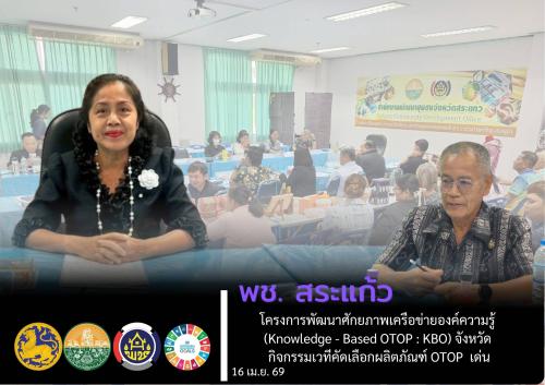 วันพฤหัสบดีที่ 16 เมษายน 2569 เวลา 13.30 น. ดร.พัชรี ศาลาศิลป์ รองผู้ว่าราชการจังหวัดสระแก้ว เป็นประธานในโครงการพัฒนาผลิตภัณฑ์ OTOP โดยเครือข่ายองค์ความรู้ (Knowledge - Based OTOP : KBO) จังหวัด กิจกรรมเวทีคัดเลือกผลิตภัณฑ์ OTOP ดีเด่นระดับจังหวัด ที่มีความโดดเด่น ซึ่งมีคณะกรรมการ KBO ระดับจังหวัดเข้าร่วมพิจารณา ณ ห้องประชุมสำนักงานพัฒนาชุมชน ศาลากลางจังหวัดสระแก้ว ตำบลท่าเกษม อำเภอเมืองสระแก้ว จังหวัดสระแก้ว